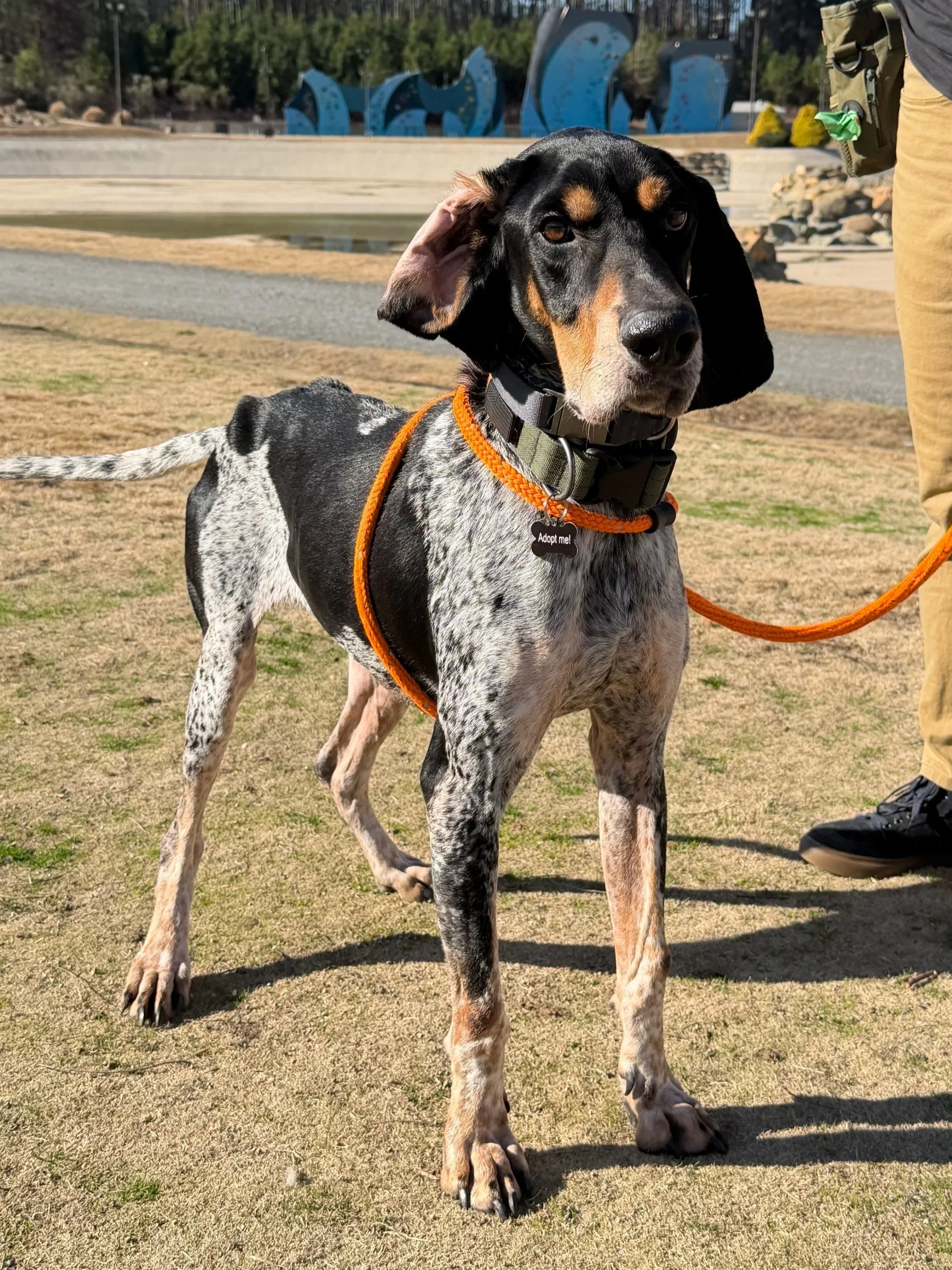 Confiscated by Animal Control after being found in a garage with five other dogs. His hold at our city shelter was 2 weeks to give owners a chance to reclaim him but thank goodness they didn’t. He was severely underweight and has spent the last few weeks fattening up! Despite being skin & bones, he’s been a sweetheart since day 1.